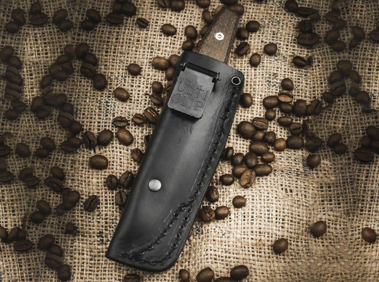 The Micarta handles are screwed onto the skeletonized tang and available in two colors (natural jute and bison). An ingenious detail is the rotating lanyard tab: you can choose whether to carry the knife with or without a lanyard hole. The included leather sheath comes with a sewn-in UltiClip, so that the knife can be clipped on to the hem of the the trousers or pocket. Thanks to the compact size and the low weight, you get a very discreet all-purpose knife, which can be worn and used every day in the spirit of Daily Knives.