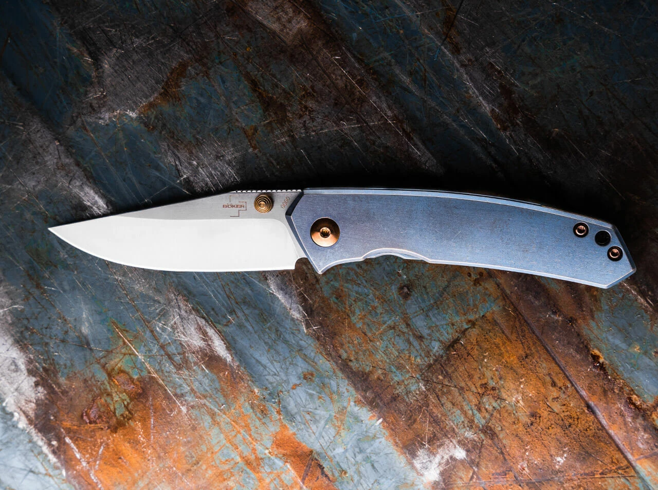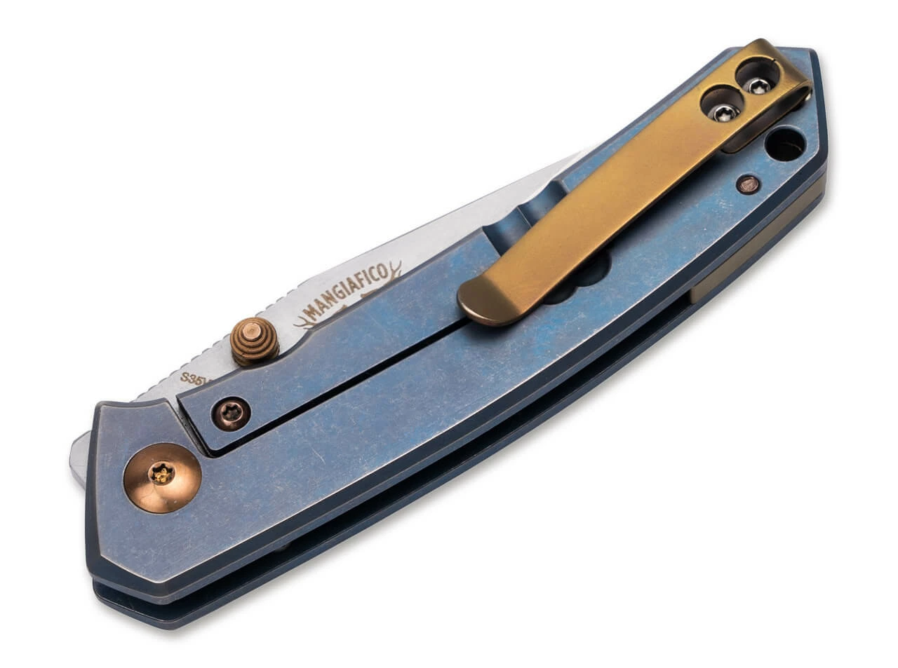 S35VN steel with a stonewashed finish, blue anodized titanium handle scales with bronze accents, and a copper thumb stud.