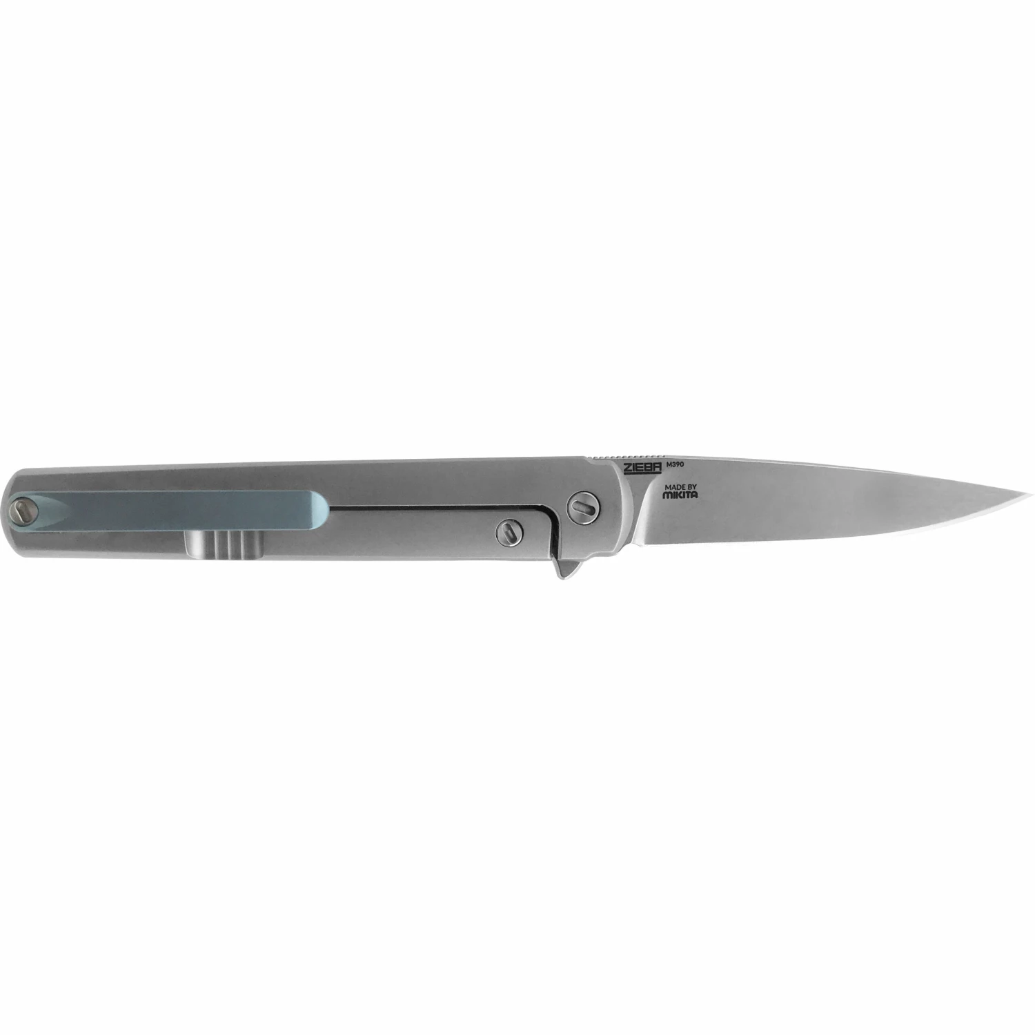 - Drop point blade made of M390 with stonewash finish