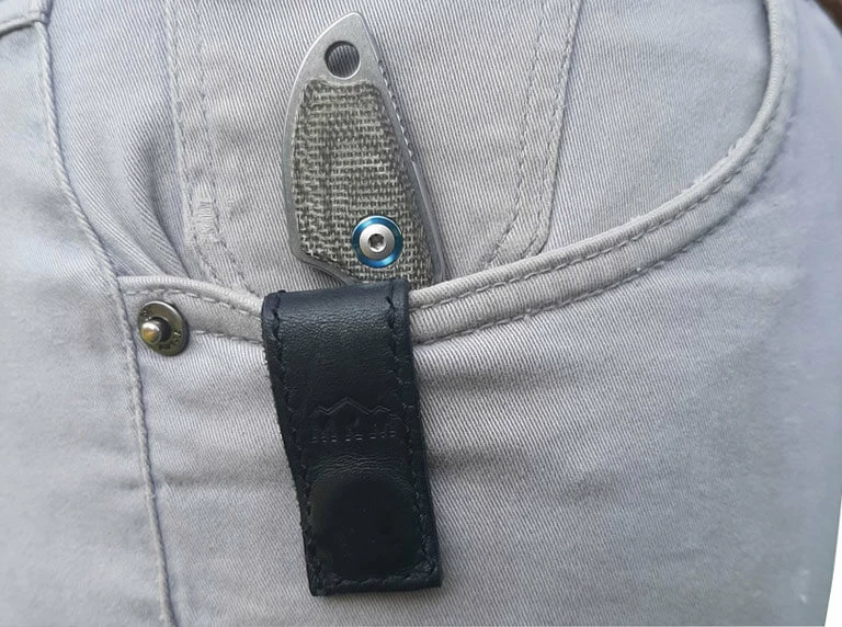 Includes a leather sheath with magnetic double lock for carrying on neck (leather cord included) or in pocket.