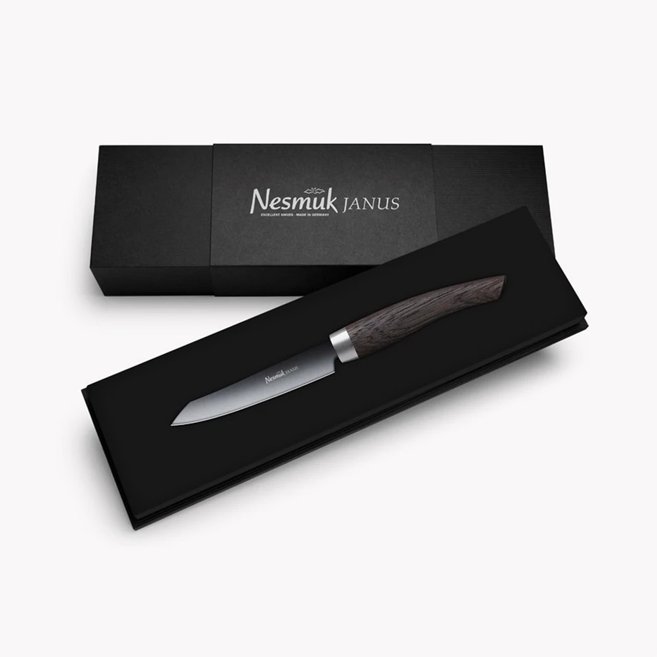 It doesn’t always have to be a full-blown chef’s knife in the kitchen. It is precisely the somewhat finer cutting tasks that require a more compact kitchen knife. Nesmuk offers the Office knife in its Janus series for this purpose.