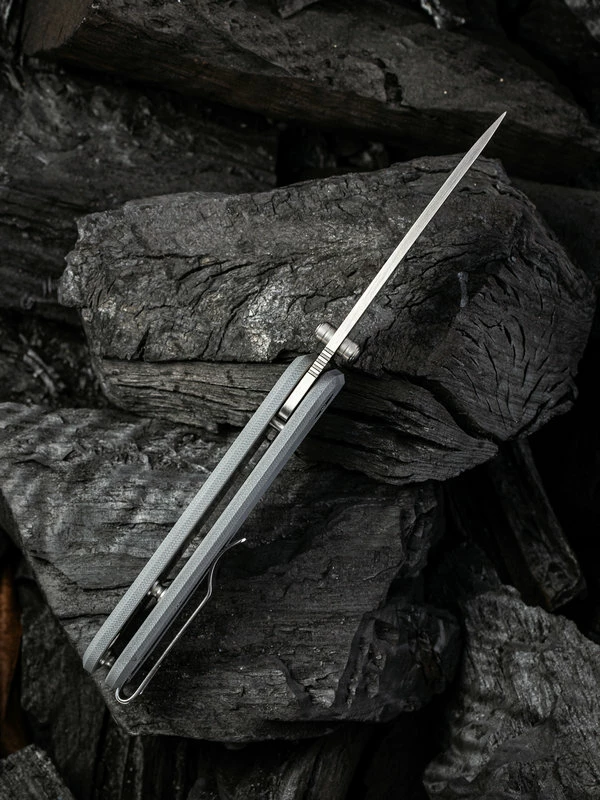 First, there’s the size: perhaps you remember Ben’s requirement that a knife be no longer than his outstretched index finger? To test this, Ben likes to put his finger out the back of the blade and see if he can reach the tip. Thanks to its unexciting, universal contour, the handle made of gray G10 is very comfortable in the hand and can be used in a variety of positions. In the back, you’ll find a lanyard hole through which you can thread a 550 paracord as a safety strap, for example. While the showside is made of a pure g10 scale, the opposite scale has a liner made of black steel, which also provides the super secure linerlock.